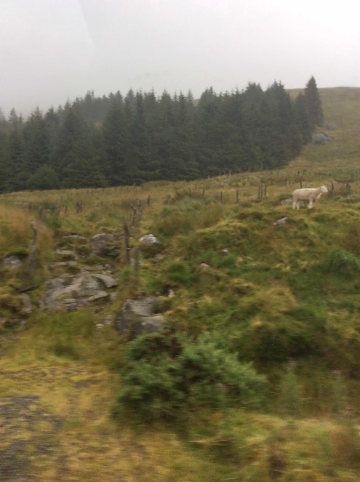 The roads we were driving on were narrow. We drove through the Wicklow mountains. It was scrub land, covered in purple Heather and yellow Gorse. Very pretty. We eventually got into farmland where we saw cows and sheep! We even saw a few of the iconic sheep on the road!